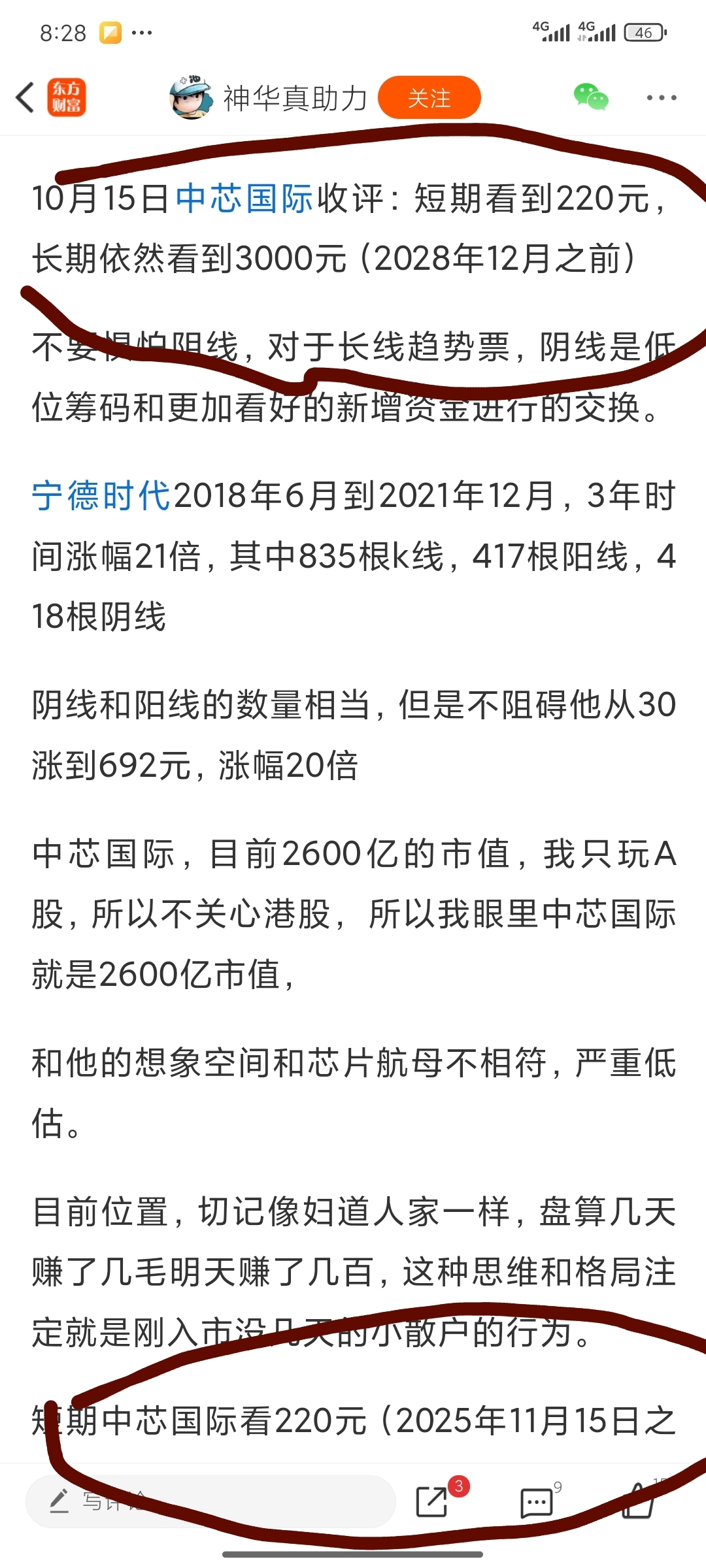 这货太逗了。还真敢想象,拿什么宁德来刻舟求剑。什么下个月15号以前能够到达220,2028年能够到达3000块。