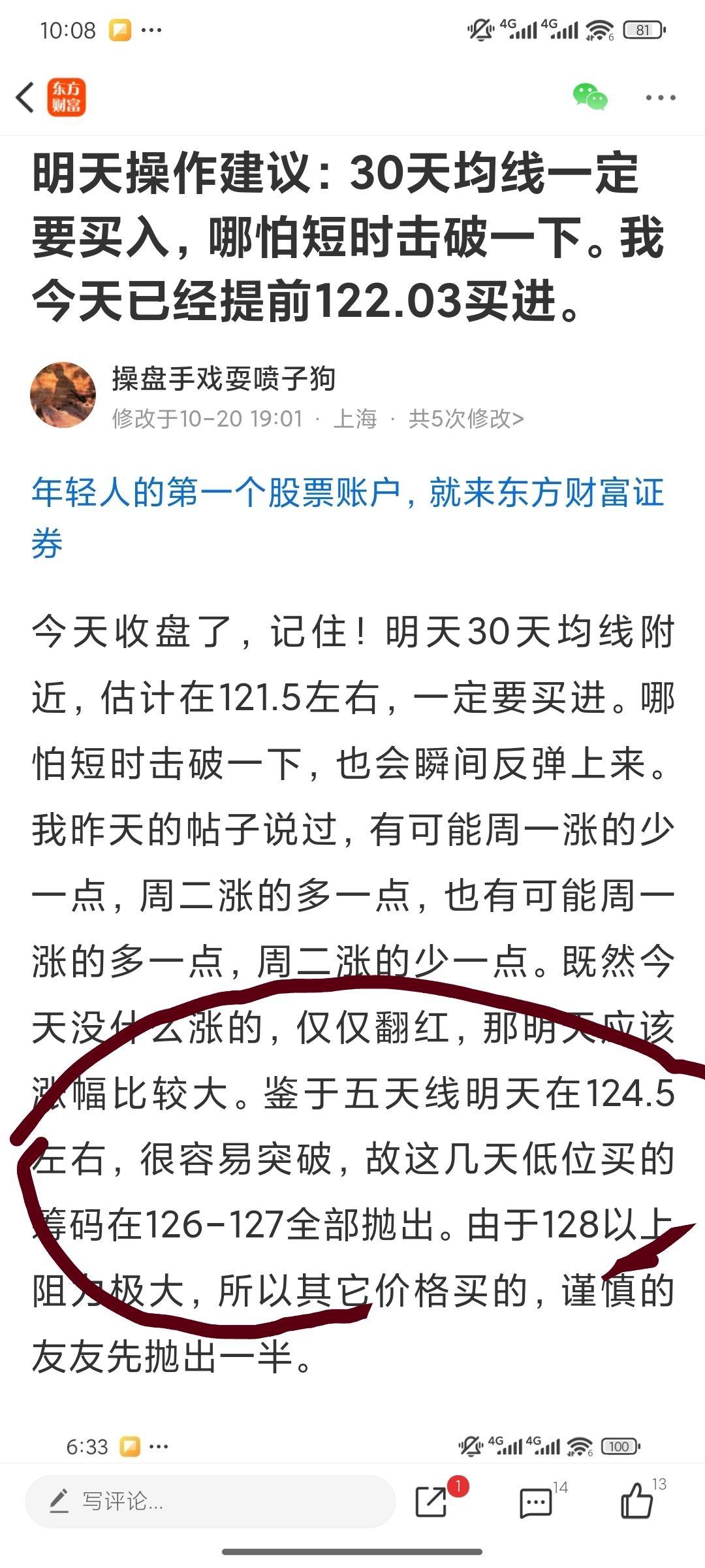 20天线(128左右)很难突破,所以还是这句话,126-127高抛为宜!今天早上突破五天均线125.19回落,看下午了。(昨天五天均线算错了,偷懒了,不能毛估估,应该老老实实五天收盘价加起来除于5)。