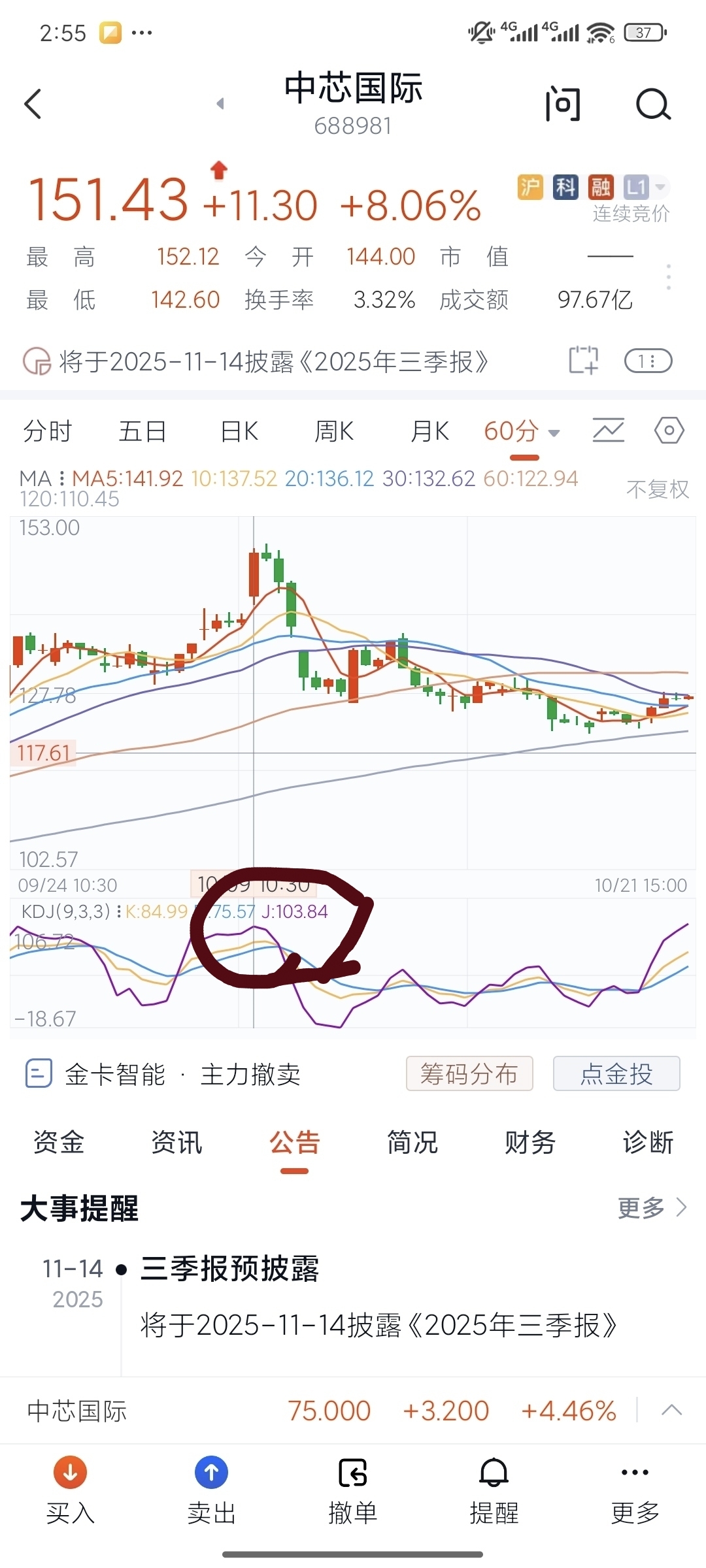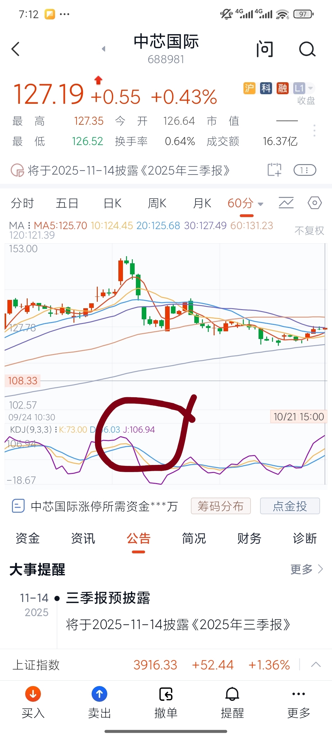 收盘前的五分钟,再给你一次去和留的选择机会。明天也许过了这个村就没有这个店了。短线操作60分钟线也很重要。注意这两张图。今天60分钟kdj已经到了极限了。上次到了150以上是103。