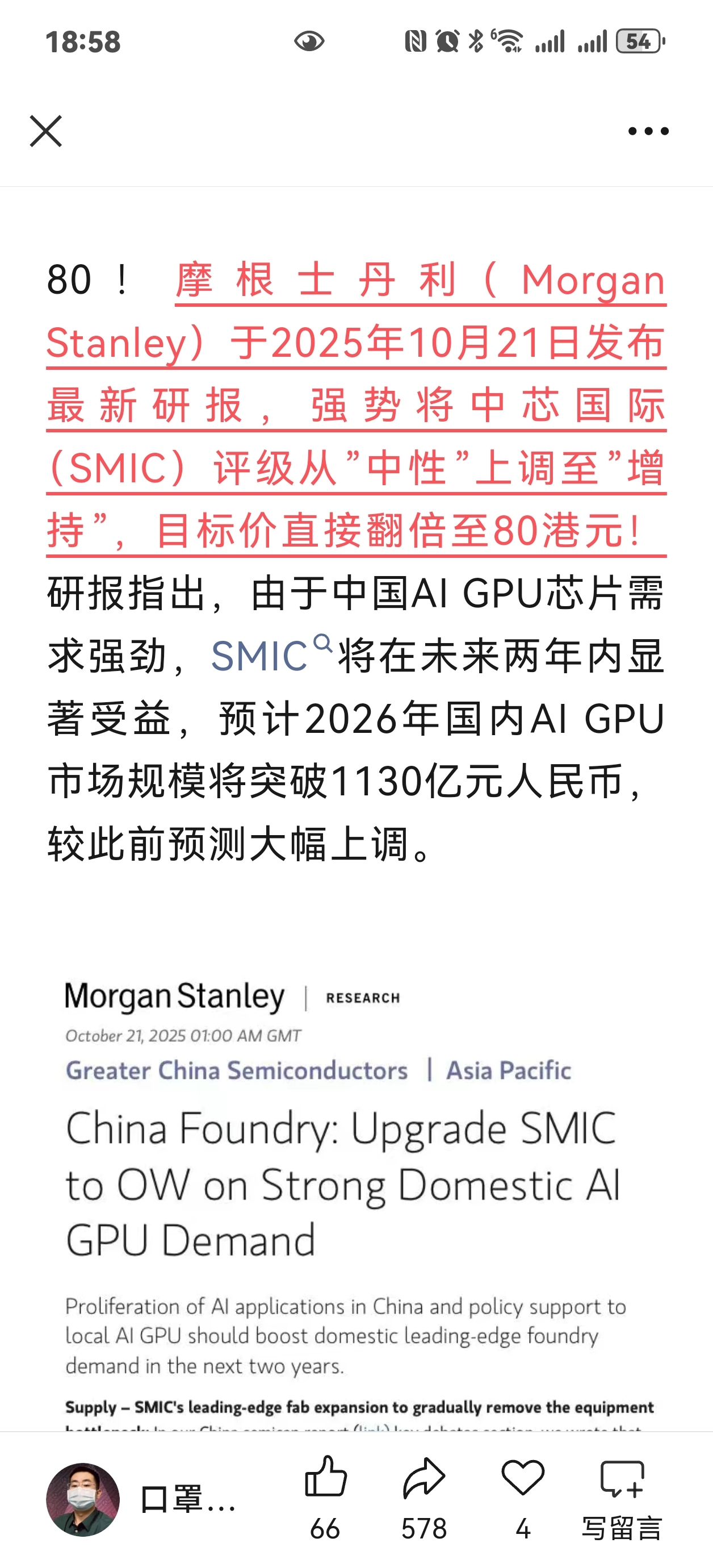 中芯国际获大摩盛赞:中国AI芯未来的关键玩家80!