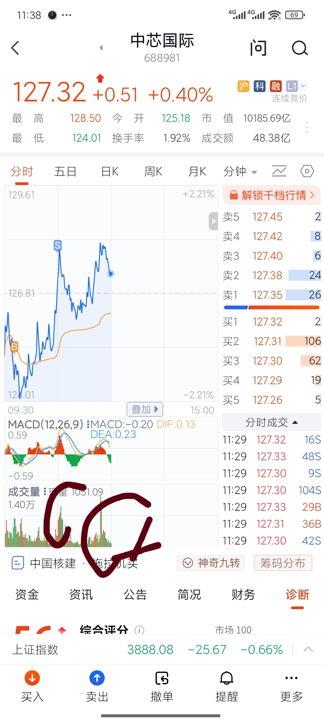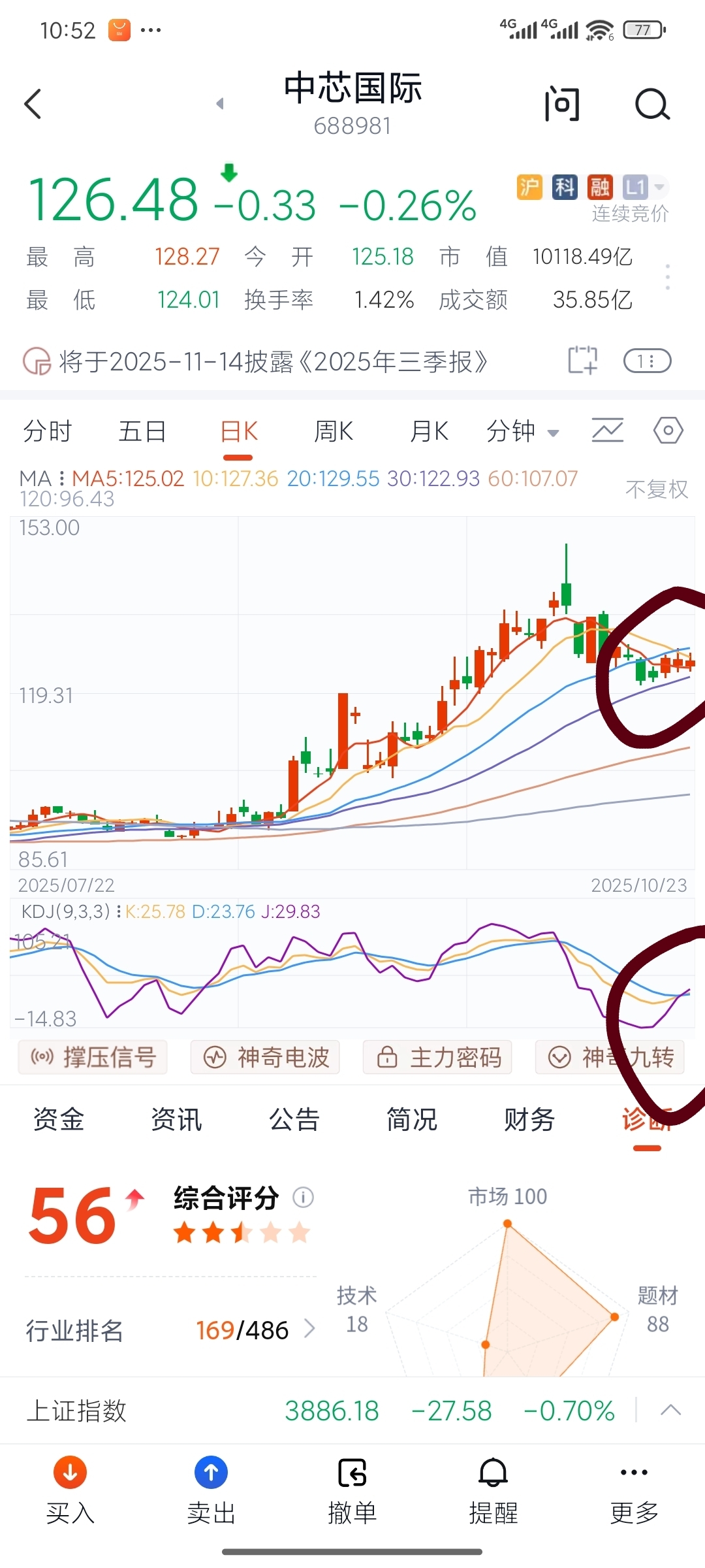 这么明显的走势,如果谁也看不见。谁也看不懂,那就是sha瓜了!如果中芯这两天是诱多,连续两天拉过128,难道是想让散户高跑吗?特别是昨天。拉过128以后又跌下来这么多,今天有几个散户到128敢追的?昨天拉上去又砸下来,吓都吓死了,呵呵。他们绝对认为是再一次逃跑的机会!所以毋庸置疑,这次主力机构或柚子绝大多数是吸货!再看一下今天的日Kdj,已经低位金叉了。大盘一稳马上飞