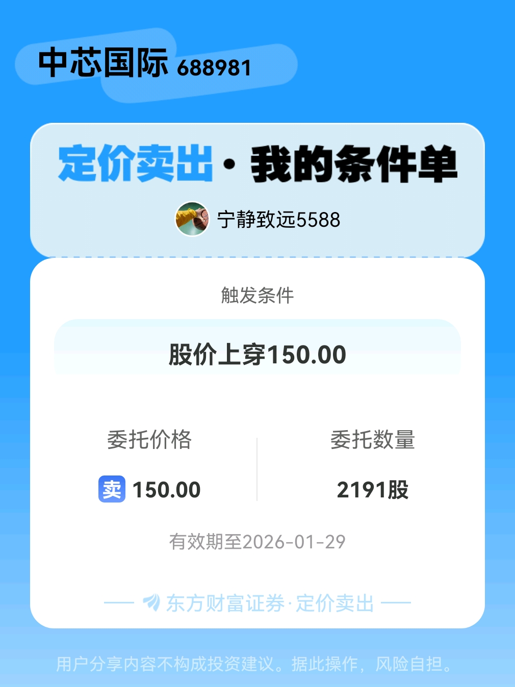 #条件单交流# #定价卖出晒单# 一位股神设置了一个定价卖出条件单,接下来就是见证奇迹的时刻~$中芯国际(SH688981)$