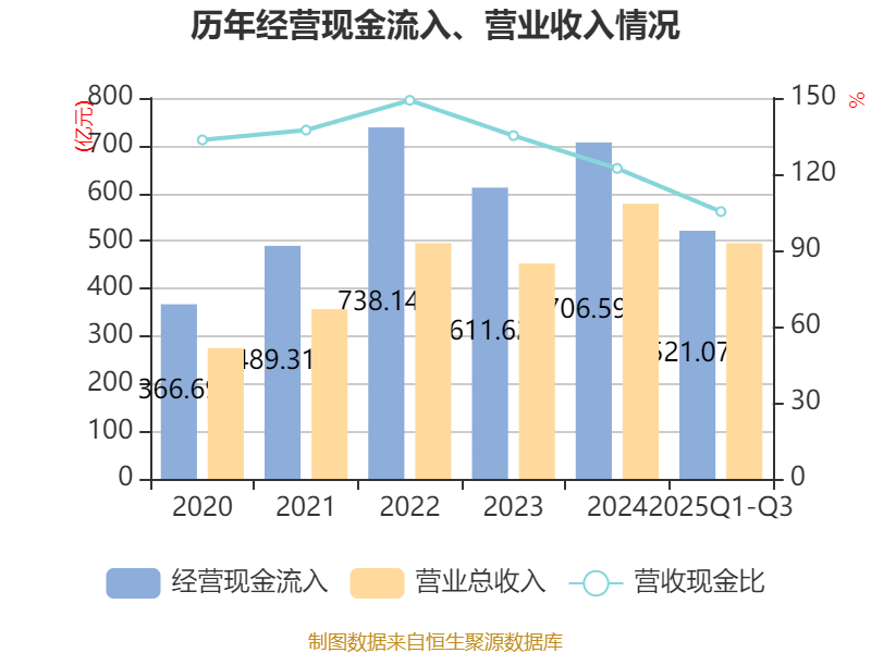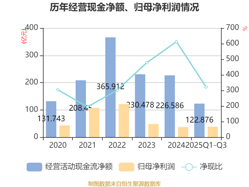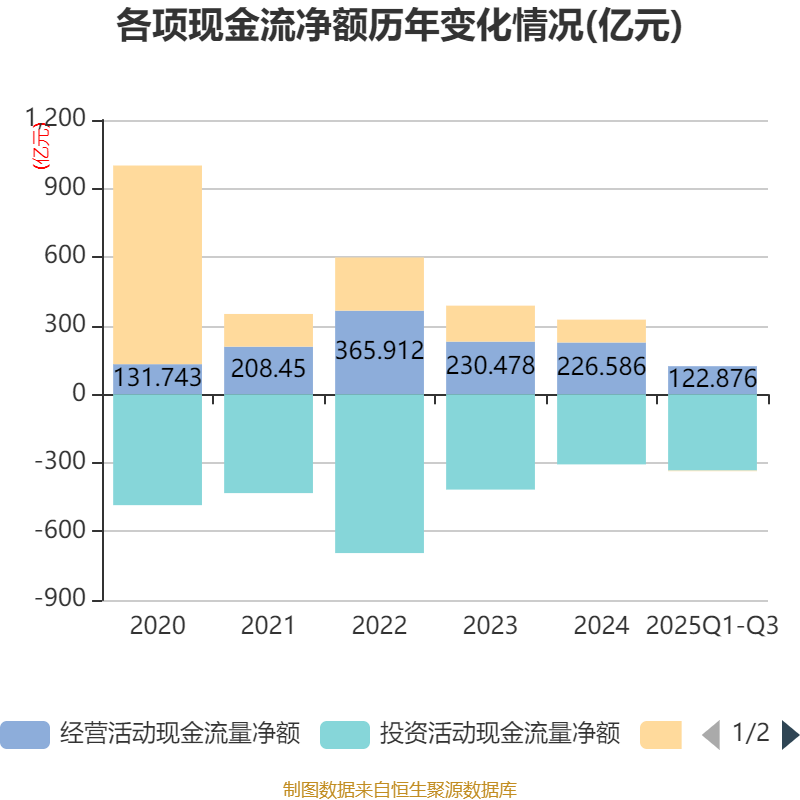 2025年前三季度,公司经营活动现金流净额为122.88亿元,同比增长0.19%;筹资活动现金流净额-2.63亿元,同比增加9.18亿元;投资活动现金流净额-333.52亿元,上年同期为-295.02亿元。