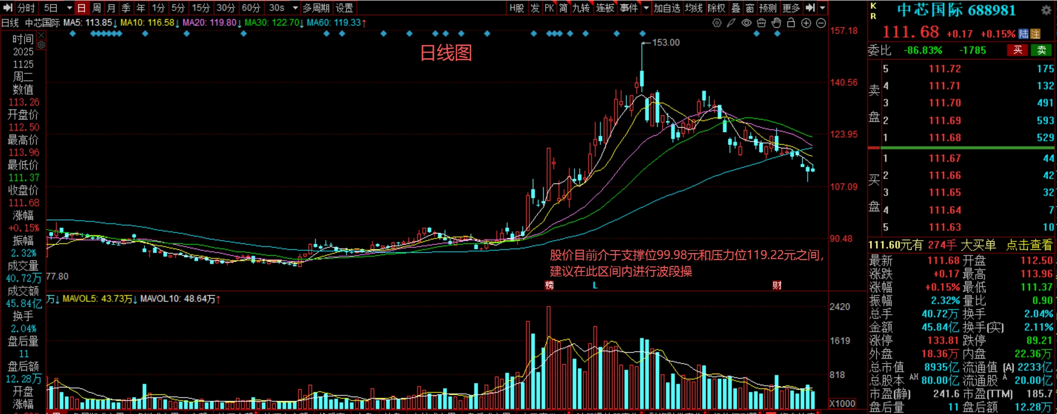 目前股价在111.68元,日内微涨0.15%,整体走势处于震荡整理格局中。从均线系统看,当前股价受到中短期均线压制,但下方在144年线(100.44元)附近有重要支撑。股价目前介于支撑位99.98元和压力位119.22元之间,建议在此区间内进行波段操作,但需注意主力资金流向,若股价无法有效突破上方均线压制,需警惕回调风险。