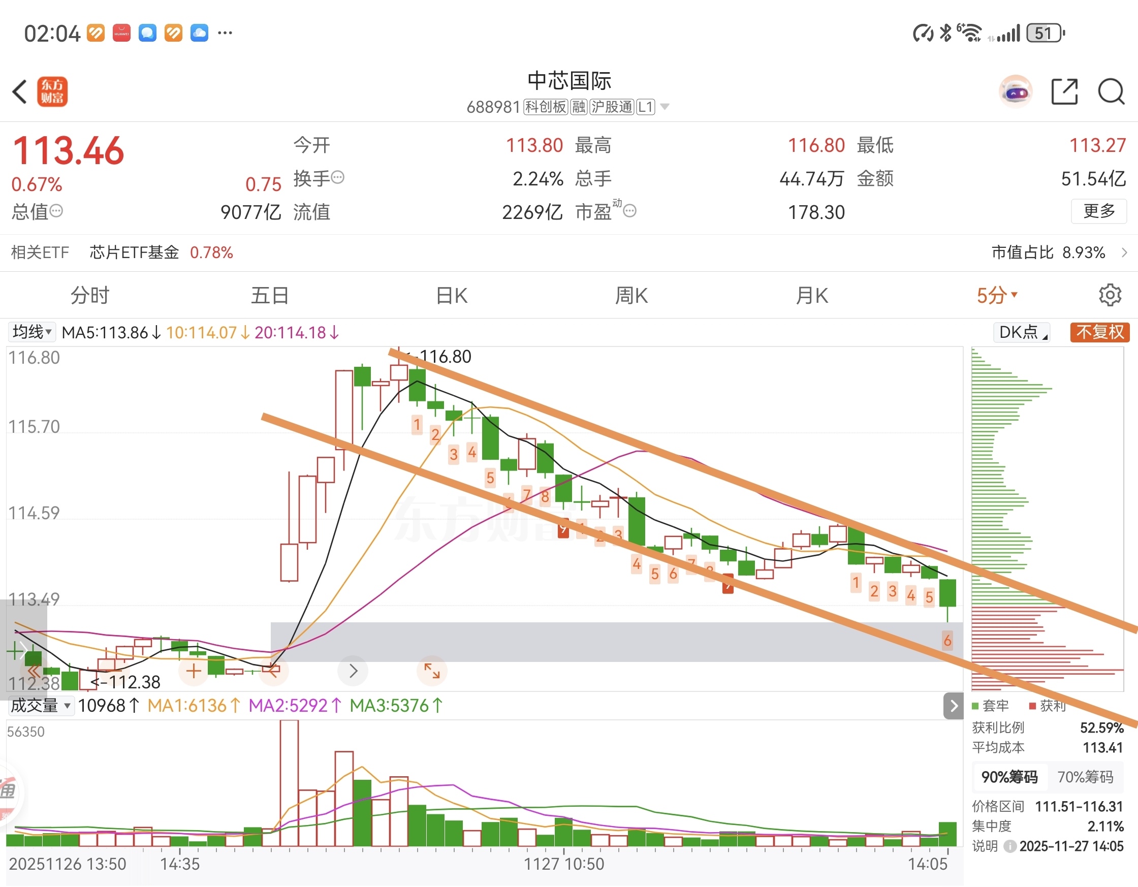 $中芯国际(SH688981)$ 五分钟线阴跌形态明显,今天套住的人,半年不会解套,散会。