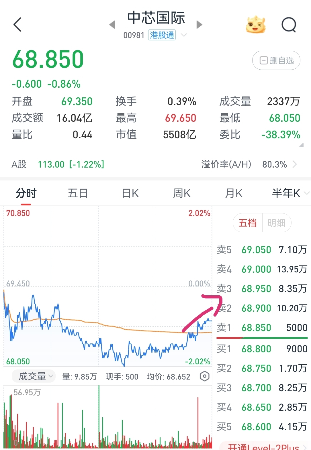 港股尾盘拉升上涨了近1%,周三中芯国际可以企稳反弹了
