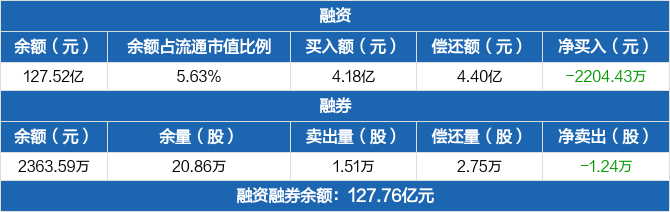 融资方面,当日融资买入4.18亿元,融资偿还4.4亿元,融资净偿还2204.43万元。融券方面,融券卖出1.51万股,融券偿还2.75万股,融券余量20.86万股,融券余额2363.59万元。融资融券余额合计127.76亿元。