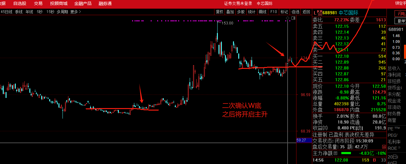 本周,中芯国际周线级别完成反转,下周将利用2天时间确W底颈线位118的支撑,之后将开展真正意义的主升行情,没有介入的将是天赐良机。