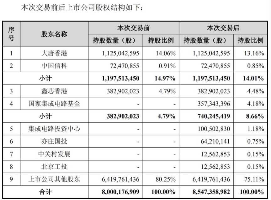 本次交易完成后,上市公司总股本将增加至8547358982股。国家集成电路基金直接持有中芯国际股份357343396股,鑫芯香港持有中芯国际股份382902023股,合计持股比例8.66%。港交所口径下,大基金一致行动人持有的H股比例被动提升至9.25%。