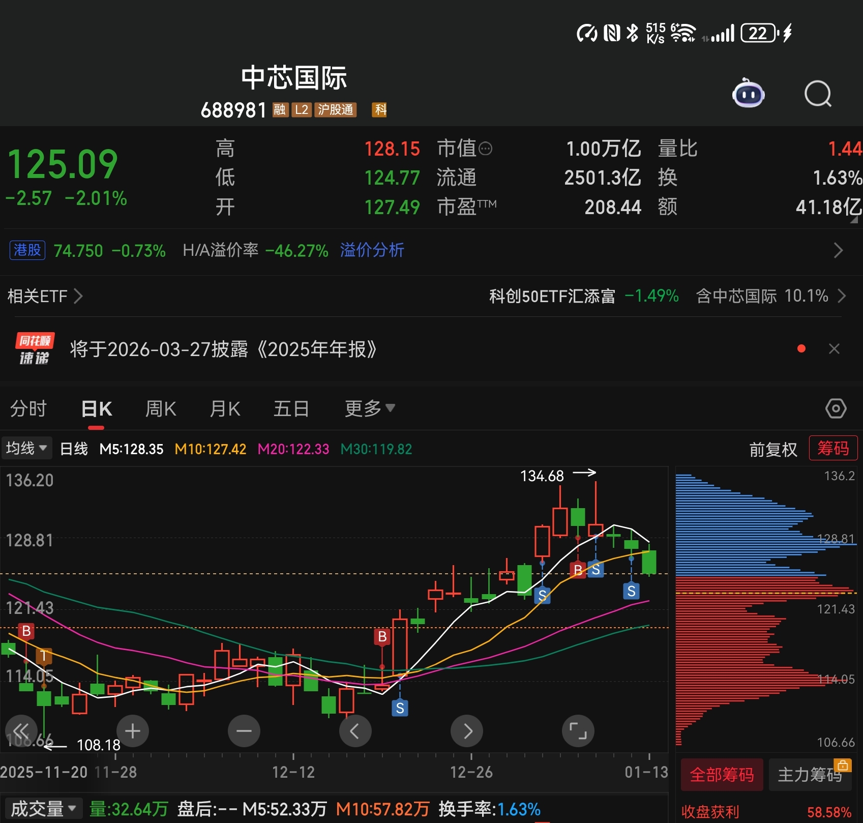 $中芯国际(SH688981)$ 知足常乐,等120左右继续回来做多。