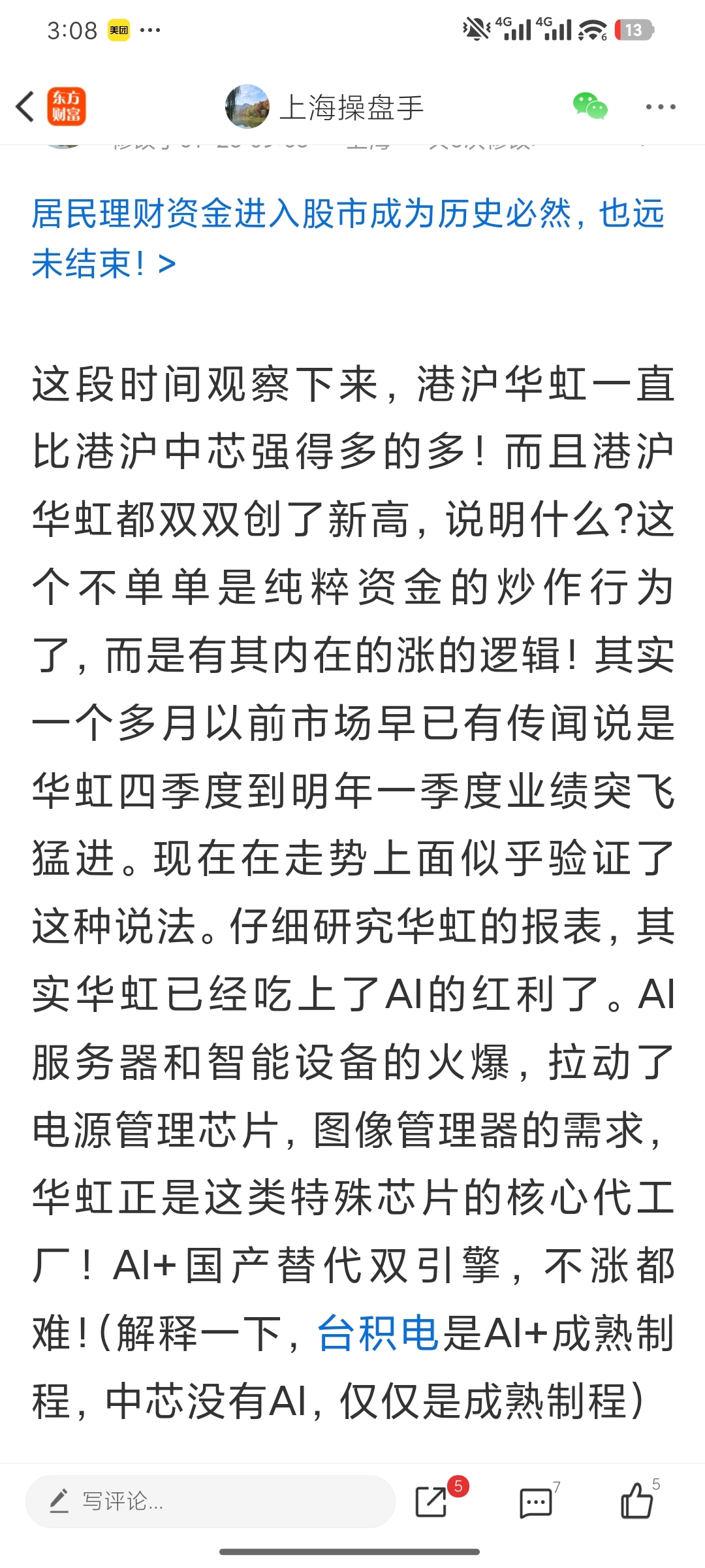 华虹盘子四个亿,流通市值远远小于海光。华虹有AI+成熟制程概念。(台积电=AI+成熟制程),相信用不了多久,华虹就会彻底甩开中芯这头大象,一骑绝尘!以前有些无知的散户还认为中芯会到180,500,1000呢,呵呵。华虹盘子这么小,有AI概念,难道不会炒到200以上吗?