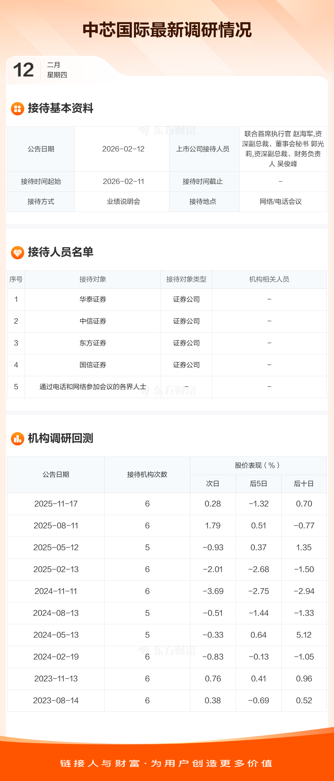 中芯国际2月12日公告称,2月11日接待华泰证券等5家机构调研。接待人员包括联合首席执行官 赵海军,资深副总裁、董事会秘书 郭光莉,资深副总裁、财务负责人 吴俊峰。