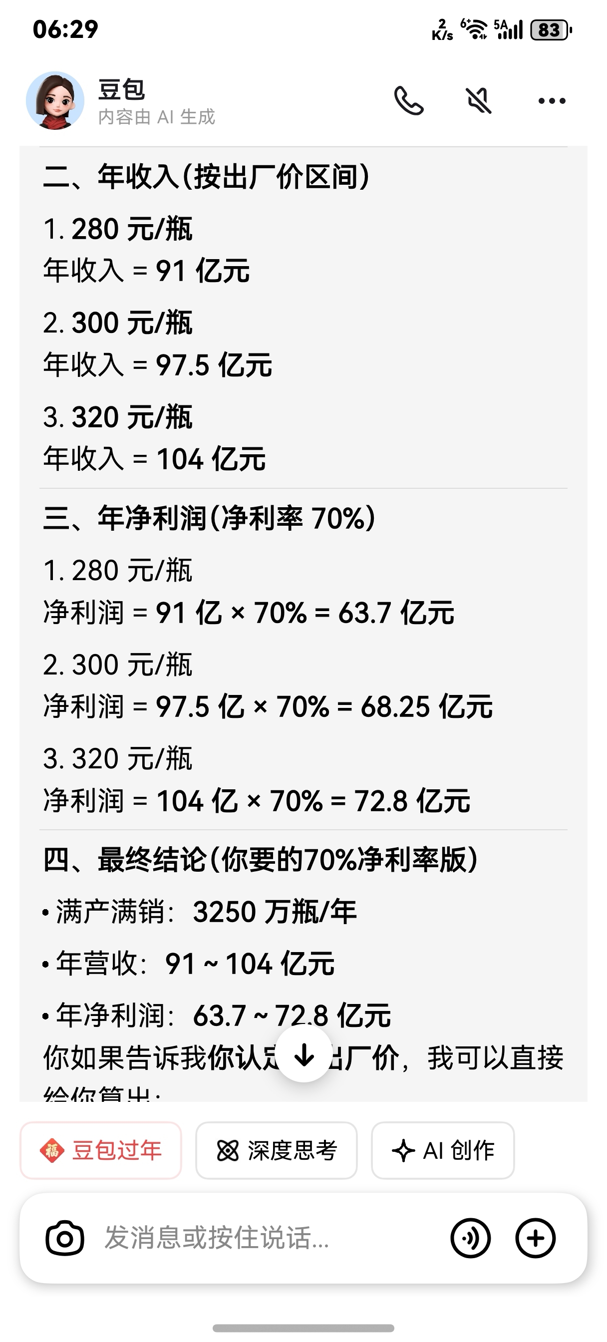 奥福民白蛋白注射液2026年一期10吨原液=50吨20%注射液,二期120吨原液=600吨20%注射液,总产能250万瓶+3000万瓶=3250万瓶×300元/瓶=97.5亿元×净利率70%=68.25亿元净利润