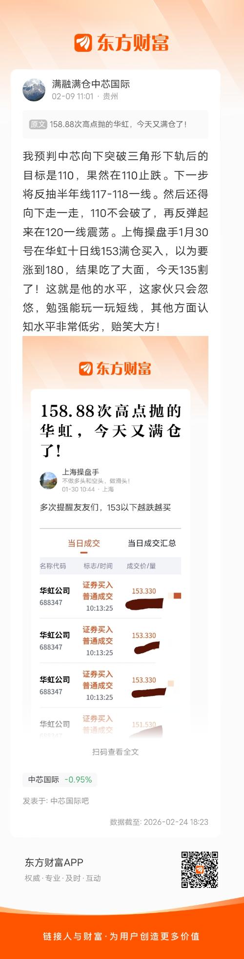 之前我预判中芯110止跌,准确!2月9日预判反抽117-118后向下,仍然准确!中芯这次还得慢慢向下,目的是将5、10、20周均线向下拉,下穿30周均线,同时压制科创50,让科创50平盘震荡,等待十月均线涨上来。中芯这次向下仍然难破110,不必担心。//@满融满仓中芯国际 :我预判中芯向下突破三角形下轨后的目标是110,果然在110止跌。下一步将反抽半年线117-118一线。然后还得向下走一走,110不会破了,再反弹起来在120一线震荡。上悔操盘手1月30号在华虹十日线153满仓买入,以为要涨到180,结果吃了大面,今天135割了!这就是他的水平,这家伙只会忽悠,勉强能玩一玩短线,其他方面认知水平非常低劣,贻笑大方!