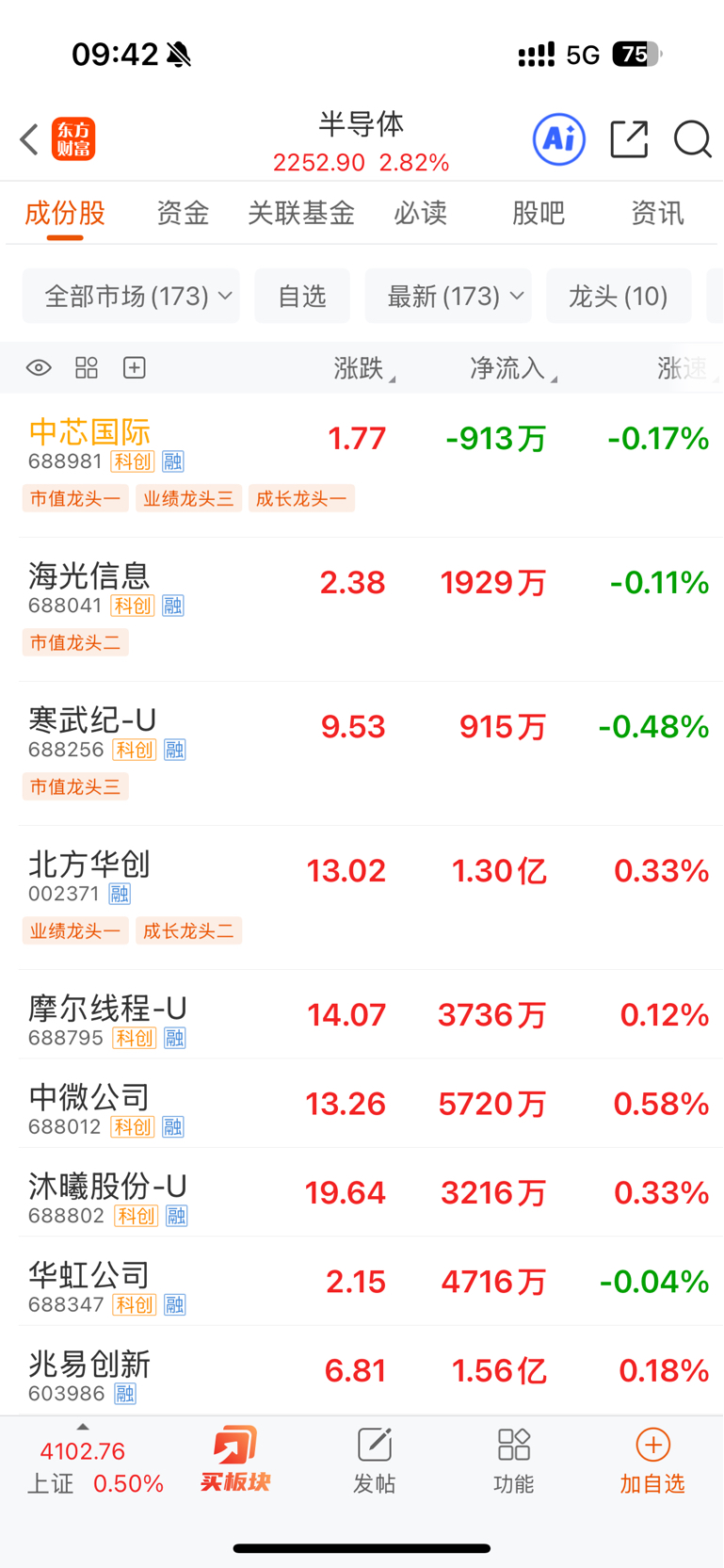 $中芯国际(SH688981)$ 真厉害,半导体按市值排序就一个净流入是绿的