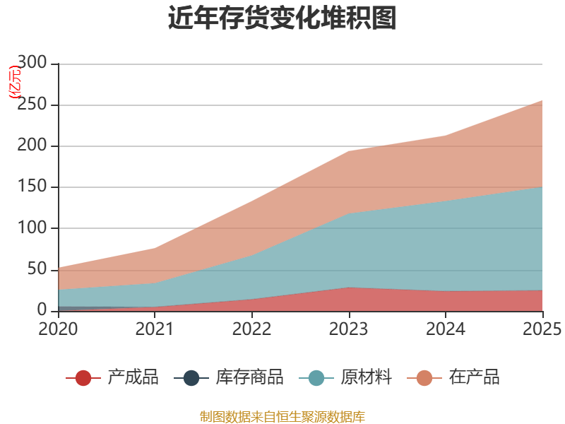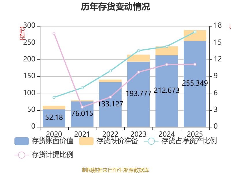 从存货变动来看,截至2025年末,公司存货账面价值为255.35亿元,占净资产的16.93%,较上年末增加42.68亿元。其中,存货跌价准备为32.04亿元,计提比例为11.15%。