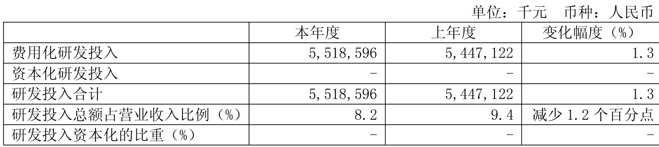 2025年全年,公司研发投入金额为55.19亿元,同比增长1.31%;研发投入占营业收入比例为8.2%,相比上年同期下降1.2个百分点。