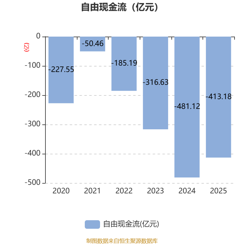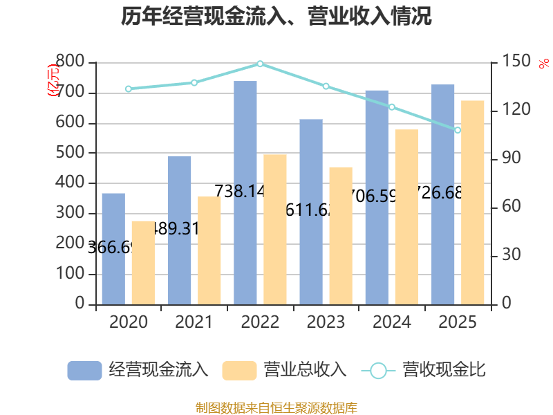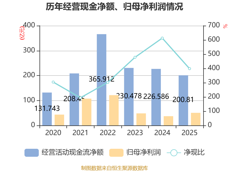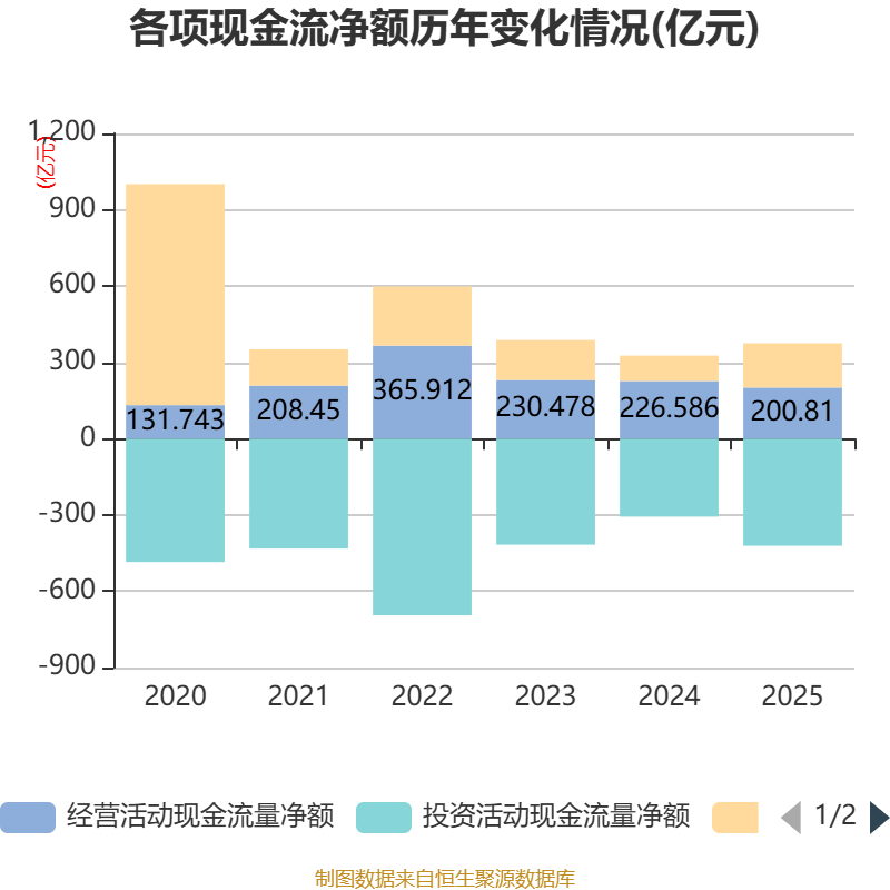 截至2025年,公司经营活动现金流净额为200.81亿元,同比下降11.38%;筹资活动现金流净额174.54亿元,同比增加74.55亿元;投资活动现金流净额-421.38亿元,上年同期为-306.69亿元。