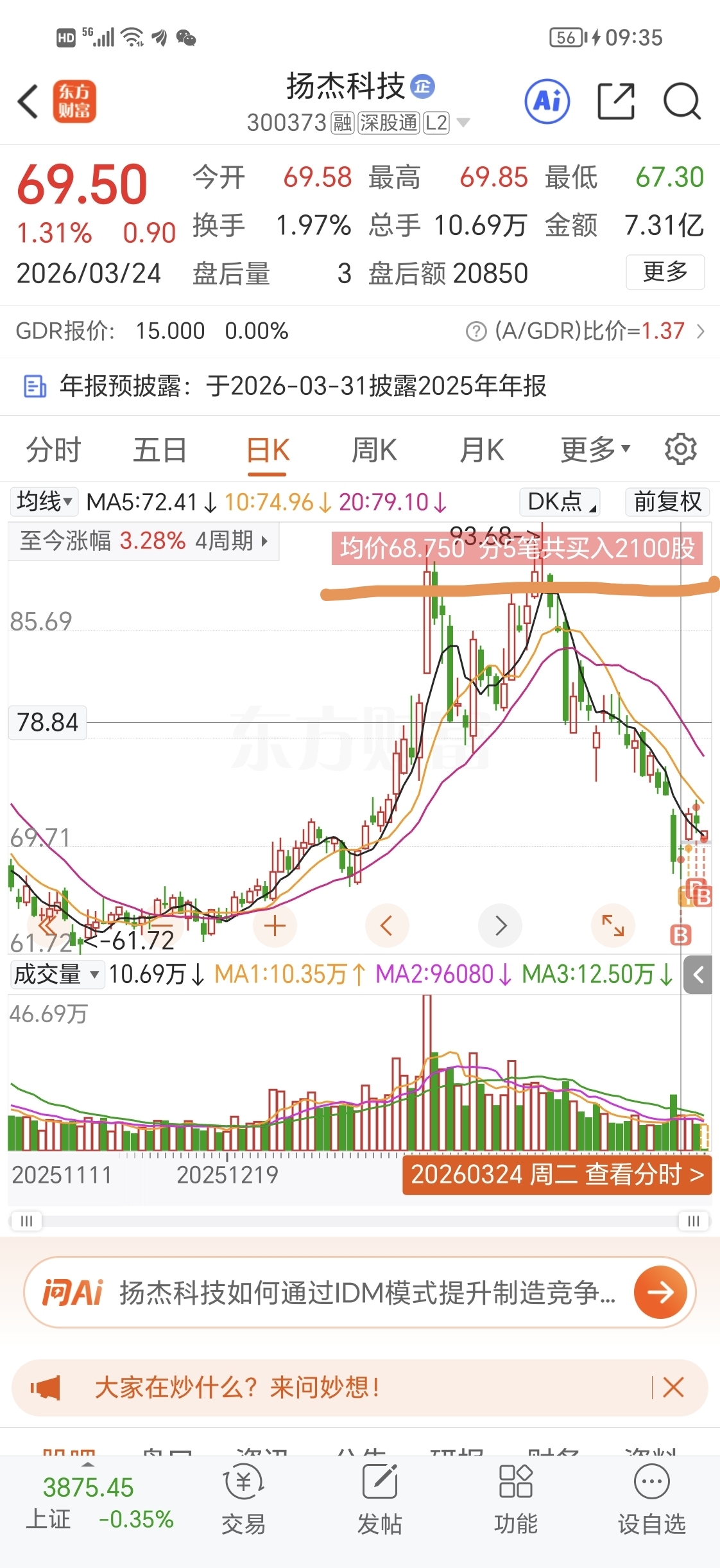 前几天68.75均价买的扬杰科技,你说别瞎折腾前天直接满仓多好,直接满仓的话这几