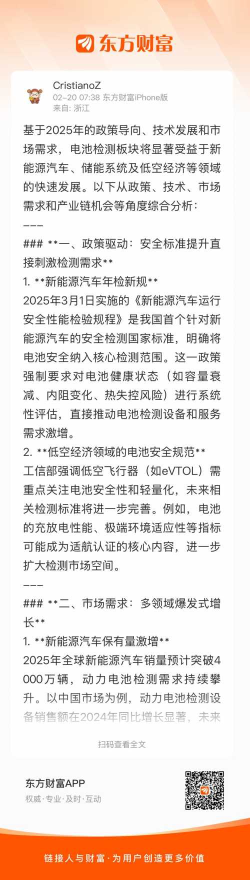基于2025年的政策导向、技术发展和市场需求,电池检测板块将显著受益于新能源汽车、储能系统及低空经济等领域的快速发展。以下从政策、技术、市场需求和产业链机会等角度综合分析: