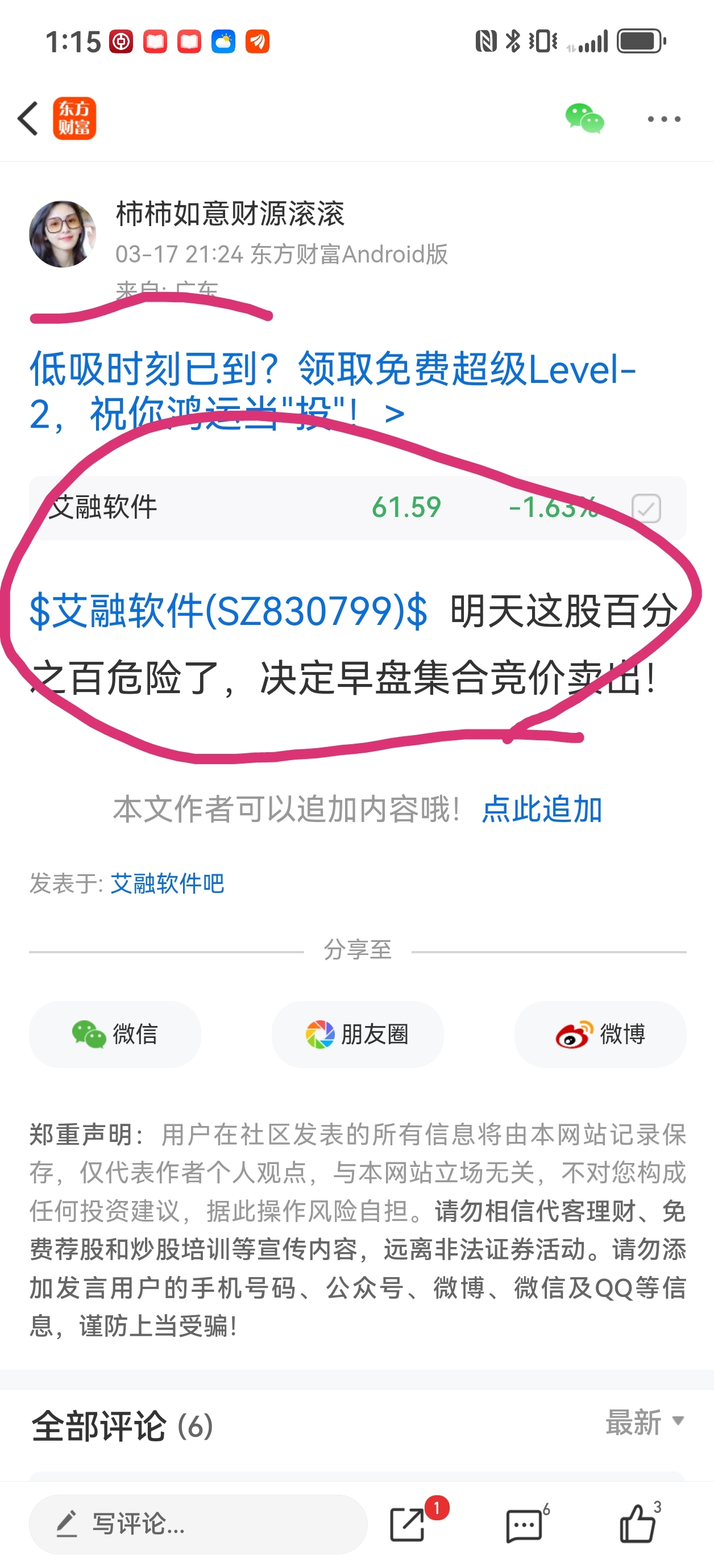 温馨提示: 1.根据《证券法》规定,禁止编造、传播虚假信息或者误导性信息,扰乱证券市场;2.用户在本社区发表的所有资料、言论等仅代表个人观点,与本网站立场无关,不对您构成任何投资建议。用户应基于自己的独立判断,自行决定证券投资并承担相应风险。《东方财富社区管理规定》