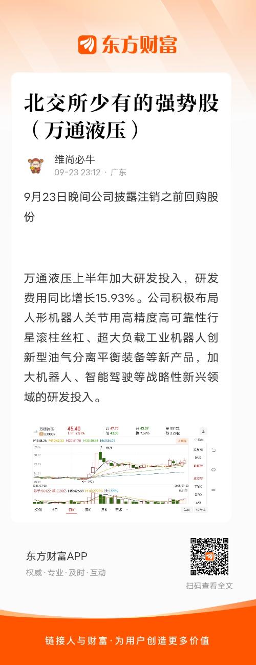 万通液压上半年加大研发投入,研发费用同比增长15.93%。公司积极布局人形机器人关节用高精度高可靠性行星滚柱丝杠、超大负载工业机器人创新型油气分离平衡装备等新产品,加大机器人、智能驾驶等战略性新兴领域的研发投入。