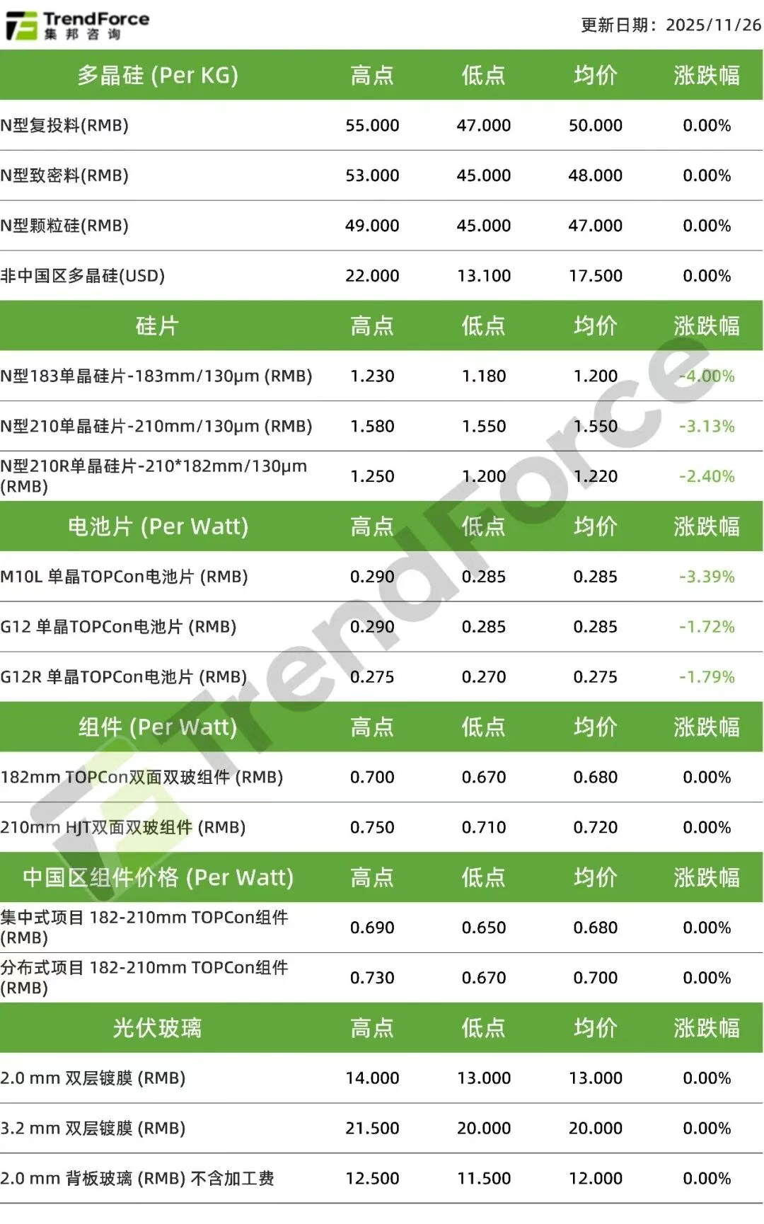 本周多晶硅价格延续“弱稳”态势,其核心支撑逻辑在于产业链的成本底线——由于下游硅片环节已触及现金成本,当前价格主要依靠硅料成本强行支撑,若硅料价格此时下调,将导致中游价格崩塌及产业链再度陷入恶性内卷。因此,硅料价格目前的坚挺对产业链整体起到了明显的托底作用