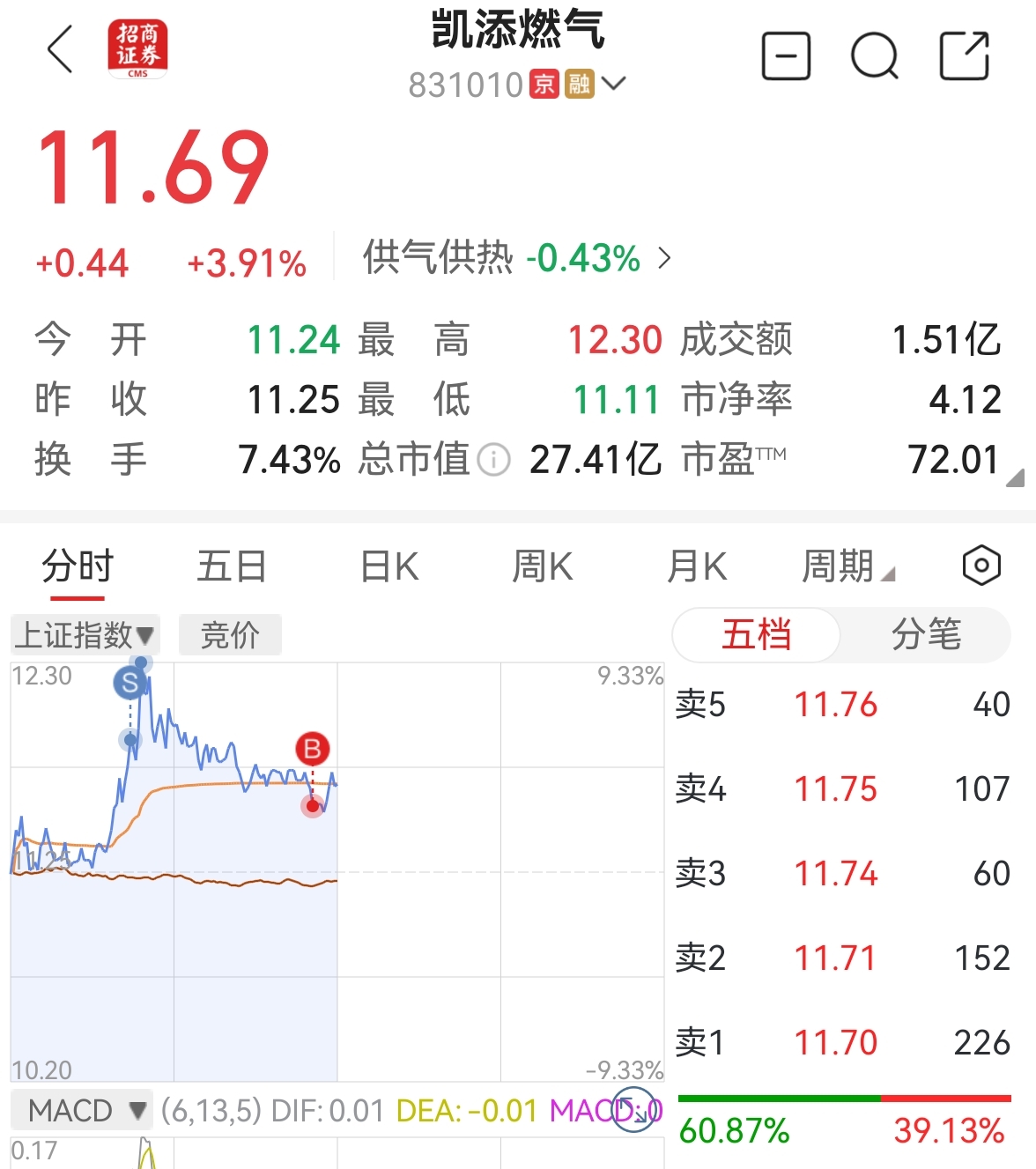 $凯添燃气(SZ831010)$ 今天能上13吗?