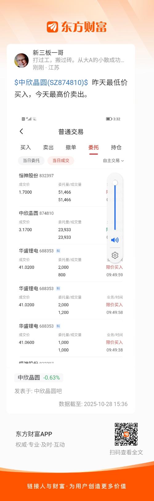 $中欣晶圆(SZ874810)$  昨天最低价买入,今天最高价卖出。