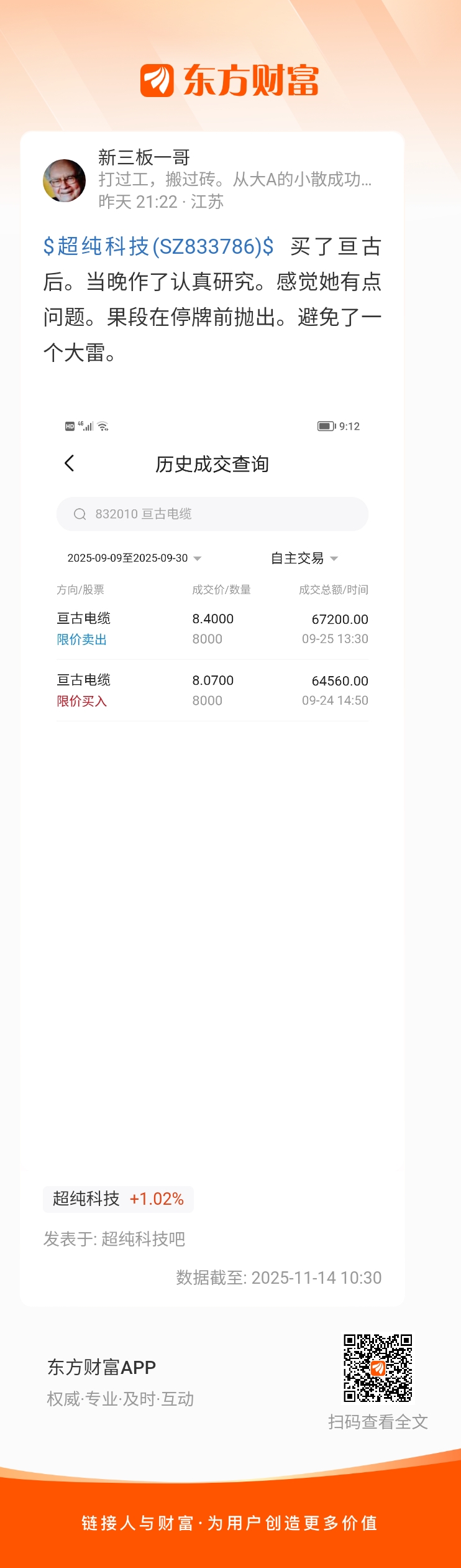 $超纯科技(SZ833786)$  买了亘古后。当晚作了认真研究。感觉她有点问题。果段在停牌前抛出。避免了一个大雷。
