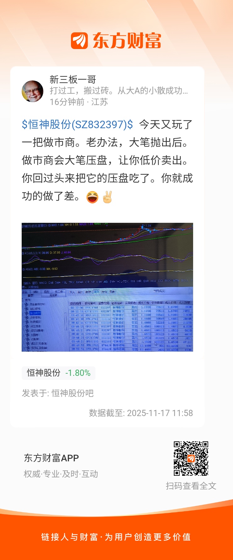 $恒神股份(SZ832397)$ 今天又玩了一把做市商。老办法,大笔抛出后。做市商会大笔压盘,让你低价卖出。你回过头来把它的压盘吃了。你就成功的做了差。