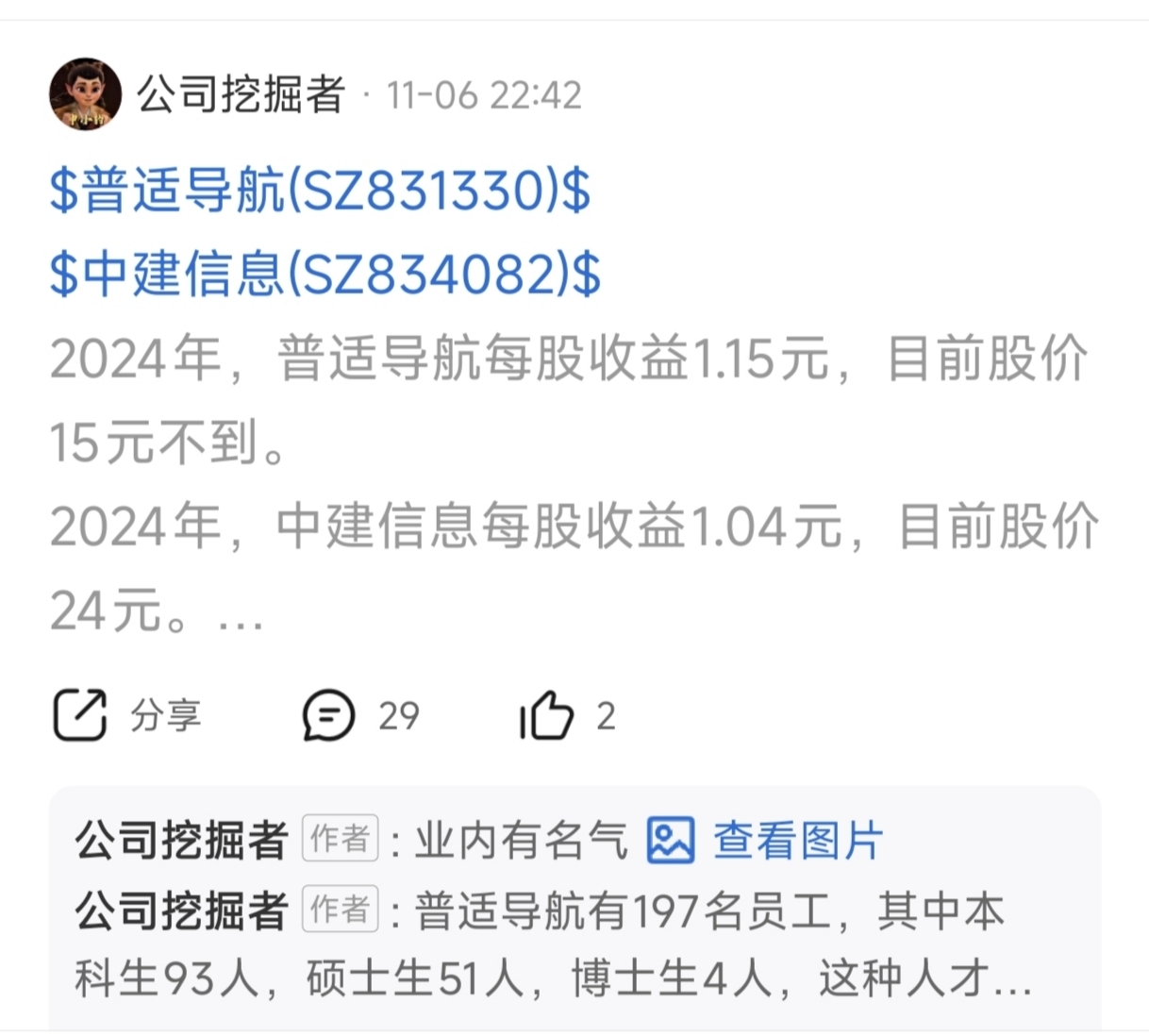 当然,中建信息是不错的企业,但没有普适导航好,民企,机制灵活,导航行业进入门槛高,低空经济、商业航天、时空大数据,公司发展空间巨大。