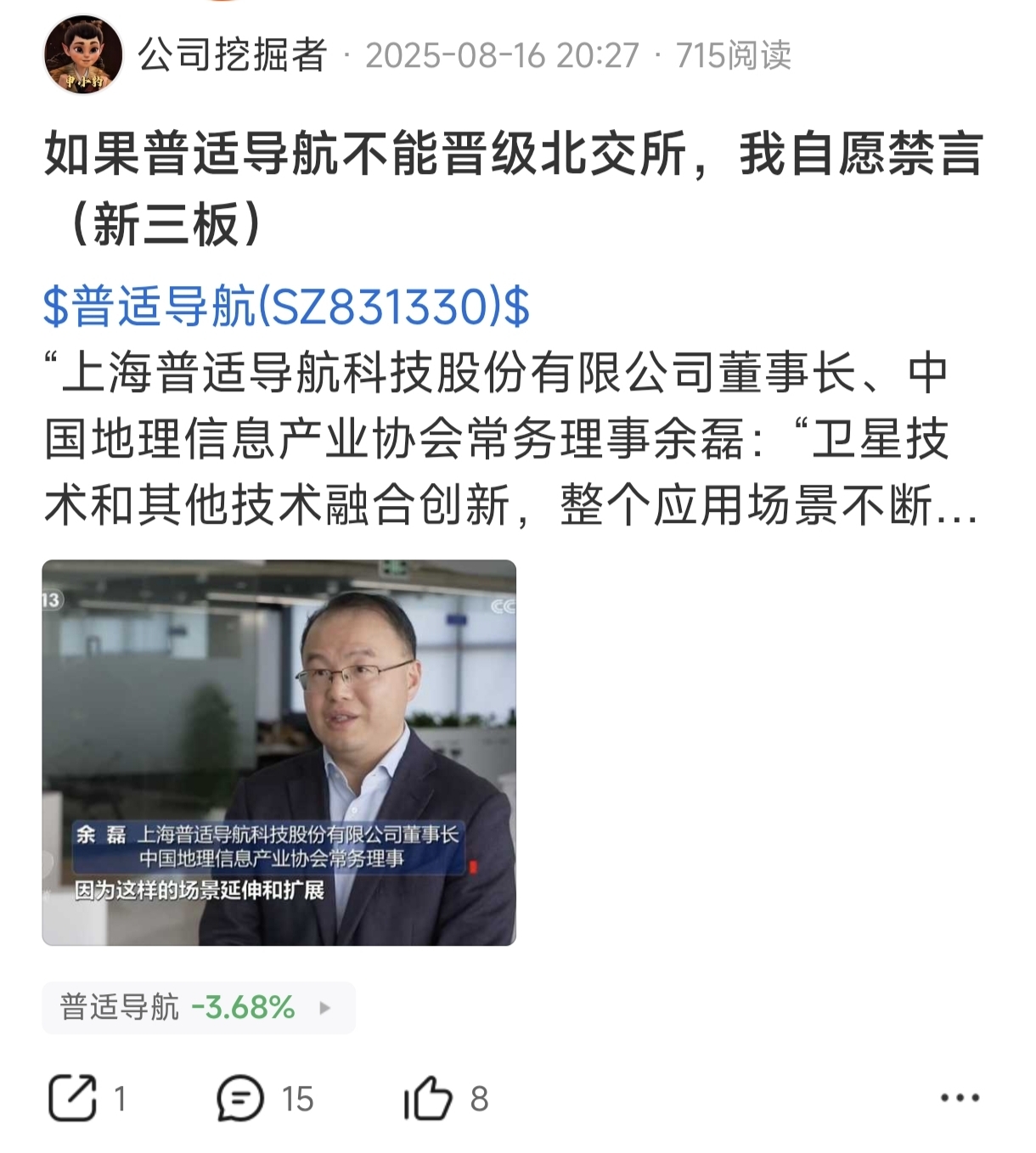 己所不欲,勿施于人。看好普适导航,8月1日买入2万股,9月底,回调到14元多后,