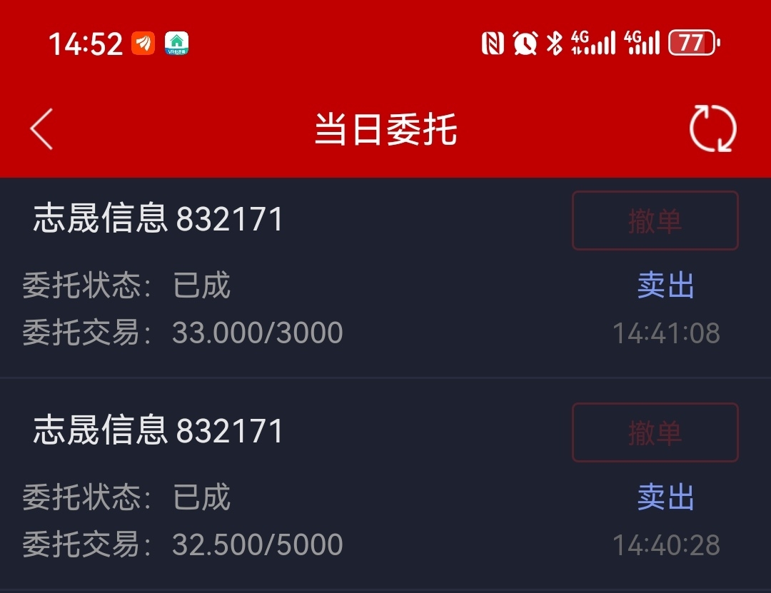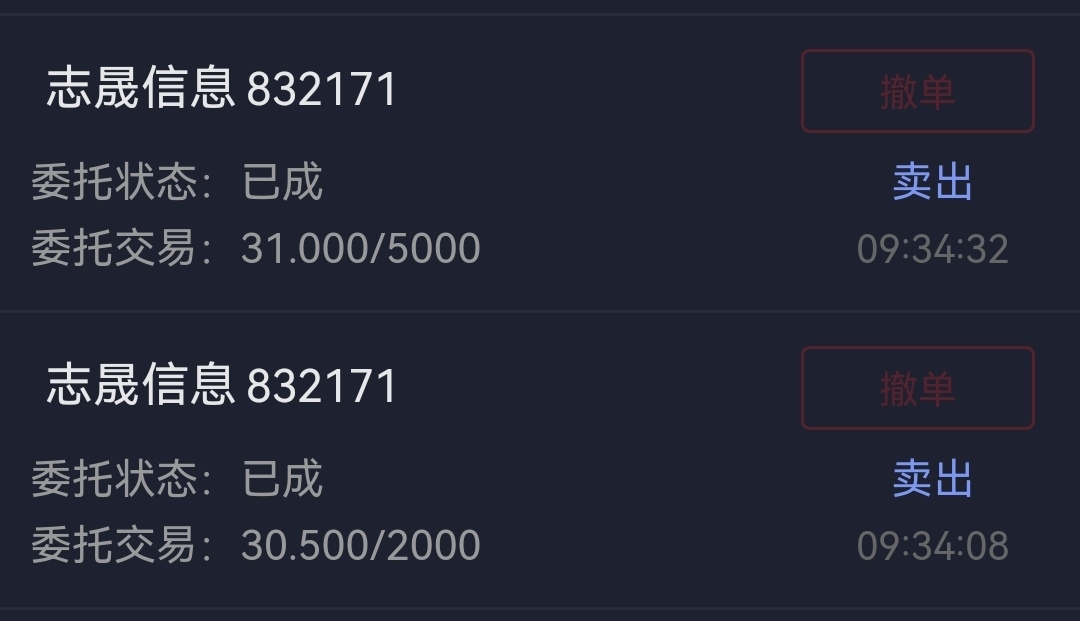志晟早上上班挂了两笔,下午挂了两笔卖亏了