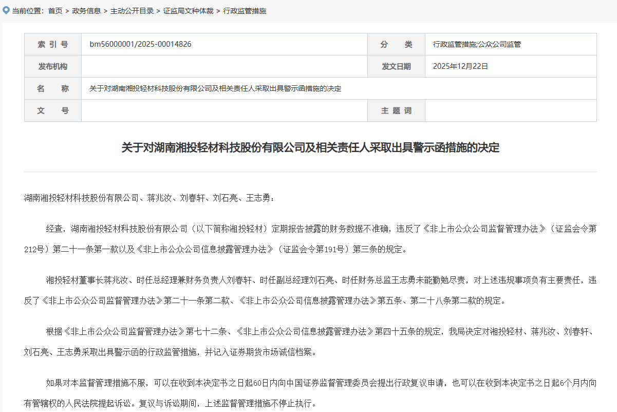 12月22日,湖南证监局发布关于对湖南湘投轻材科技股份有限公司及相关责任人采取出具警示函行政监管措施的决定。
