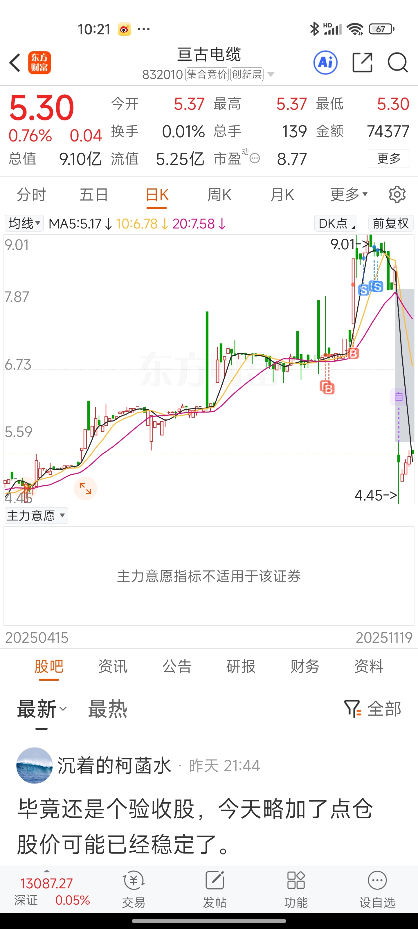 $亘古电缆(SZ832010)$ 停牌前买了找准机会再买入