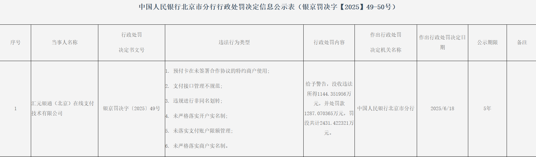值得一提的是,2025年6月,汇元科技子公司汇元银通被中国人民银行北京市分行罚没2431.42万元,涉及的违法行为类型包括预付卡在未签署合作协议的特约商户使用、支付接口管理不规范、违规进行非同名划转、未严格落实开户实名制、未落实支付账户限额管理、未严格落实商户实名制。