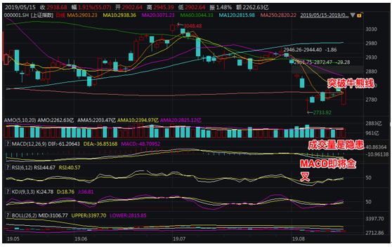 从技术指标来看,MACD绿柱继续缩短,且有金叉的趋势,KDJ、RSI均金叉。美中不足的是,成交量始终没有放大,依旧是存量资金博弈的结果,在没有较大的增量资金情况下,或将继续在目前箱体内(2733-2900点)震荡。值得关注的是,指数已连续两日站上牛熊线,若明日能继续站稳牛熊线,则后市可更为乐观一些。