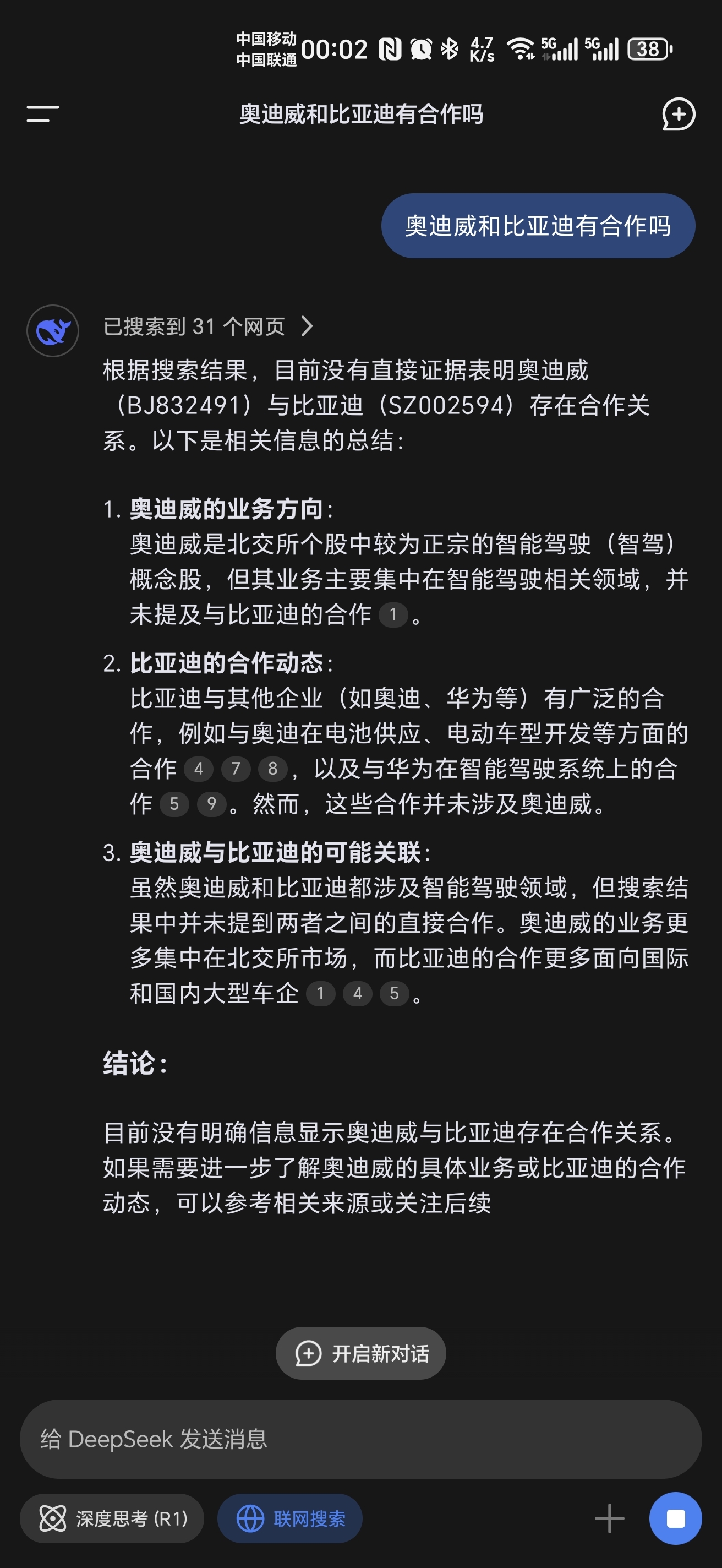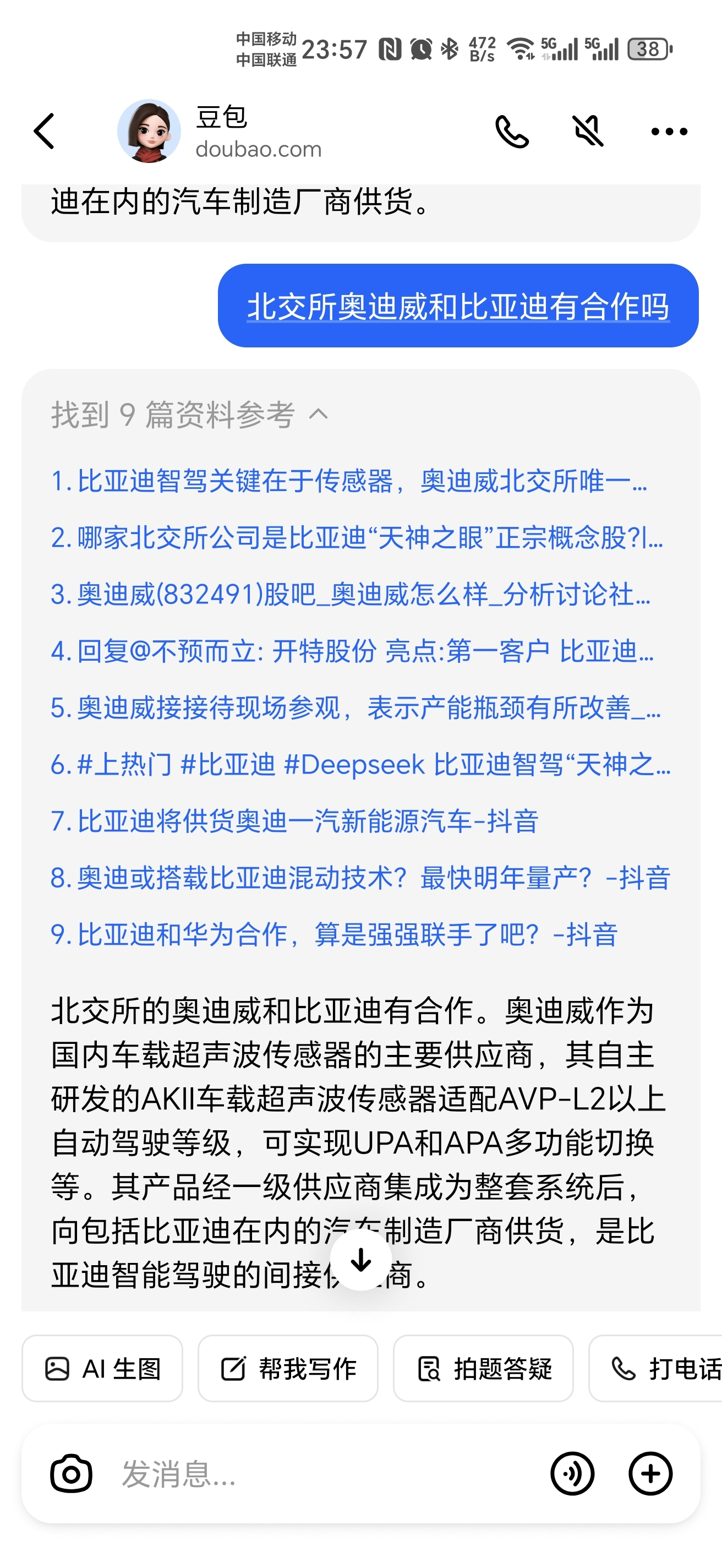 $奥迪威(SZ832491)$ 虽然我也持股, 但是理性的讲,奥迪威跟比亚迪没直接合作,人家传感器是开特的,你们看豆包的数据来源就是股吧,这都是你们自己说的,被豆包归纳总结了。。同样的问题问 deepsek,