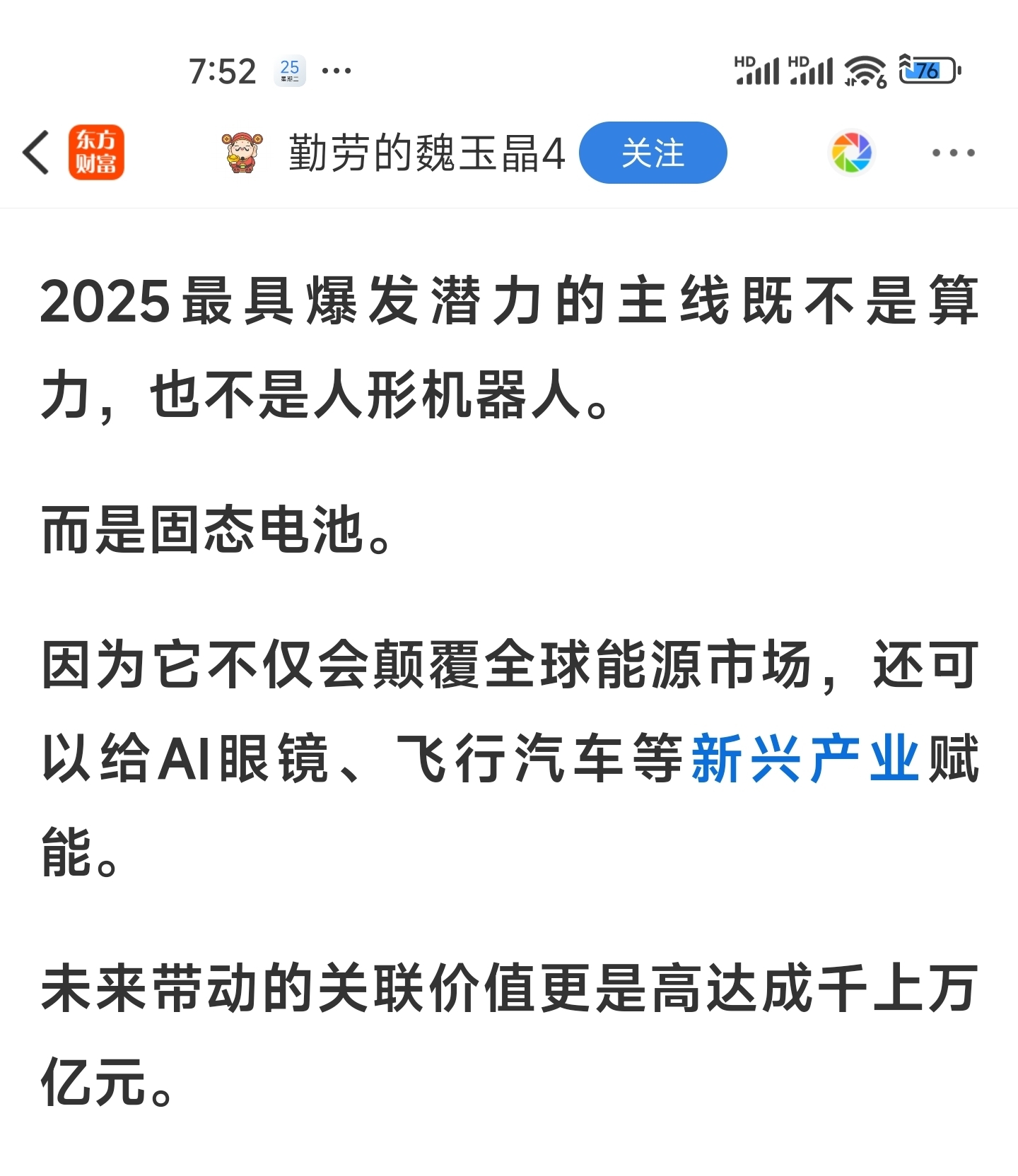 东财网新帖今年非人形机器人年,亦非算力年,而是固态电池年。找了二个小时,看了几十