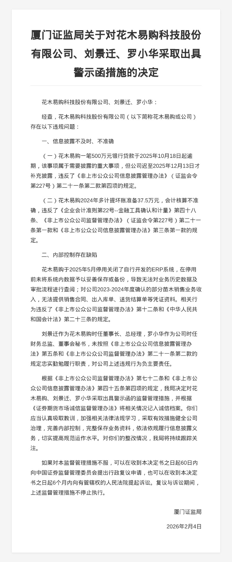 对此,厦门证监局决定对花木易购、刘景迁、罗小华采取出具警示函的监督管理措施,并将相关情况记入诚信档案。