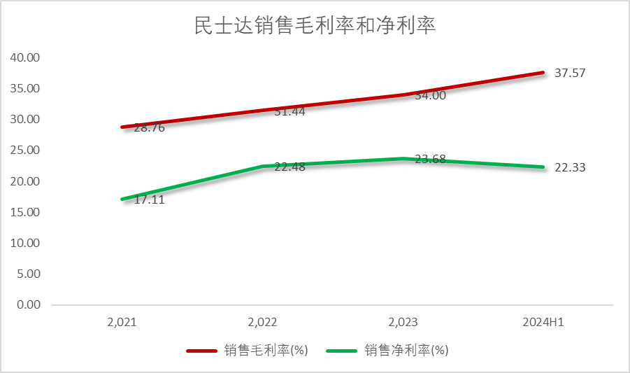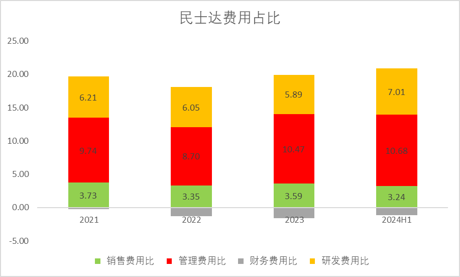 公司的销售费用占比逐年下降,管理费用略有上升,研发费用略有下降,在24H1上升。
