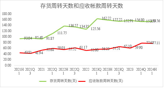 比较值得担心的公司的应收帐款循环天数从21和22年的不到43天,到24年H1的77天,公司的存货周转天数也逐渐上升从93天到最新的153天,这不得不让人担心。