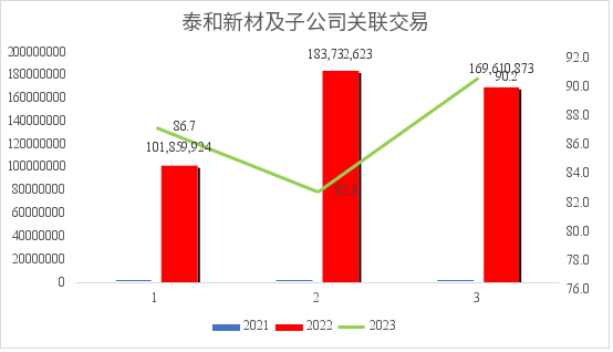 控股股东泰和新材与公司的关联交易占比过高,从21年的87.3%,上升到23年的90.2%。