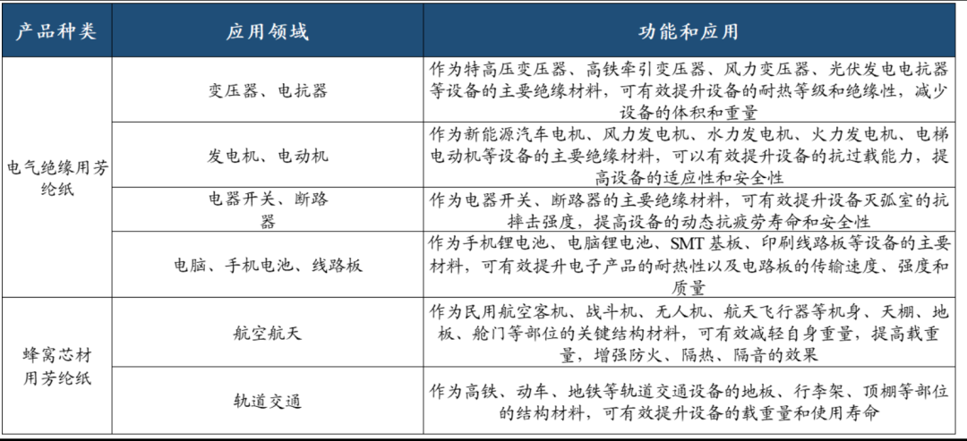 芳纶纸系列产品主要用于电气绝缘领域和蜂窝芯材领域,对应下游应用场景诸多。