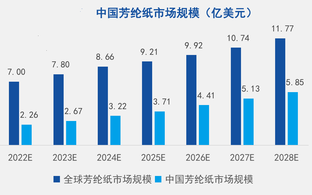 全球芳纶纸22年市场规模约7亿美元,预计2028年增长至11.77亿美元,复合增速约9%;中国芳纶纸市场规模从2017年的1.24亿美元增长至2022年的2.26亿美元,预计2028年将达5.85亿美元,复合增速17%。