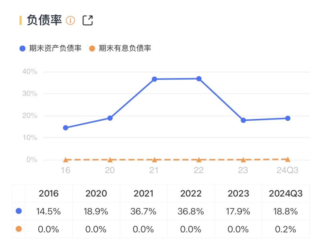公司的负债率比较低,23年只有17.9%,24年Q3增加了一些有息负债但不高。
