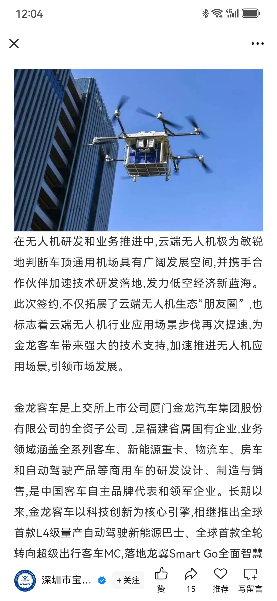 $华维设计(SZ833427)$ 作为新质生产力的代表,低空经济不仅为传统产业注入了新的活力,更催生了全新的商业模式和业态,为经济增长提供了新的驱动力。近日,深圳云端无人机有限公司与厦门金龙联合汽车工业有限公司签署技术开发合作协议,聚焦无人机车顶机场科技创新,助力低空经济创新发展。在无人机研发和业务推进中,云端无人机极为敏锐地判断车顶通用机场具有广阔发展空间,并携手合作伙伴加速技术研发落地,发力低空经济新蓝海。此次签约,不仅拓展了云端无人机生态“朋友圈”,也标志着云端无人机行业应用场景步伐再次提速,为金龙客车带来强大的技术支持,加速推进无人机应用场景,引领市场发展。此次合作,云端无人机和金龙客车将利用各自技术优势,共同研发一款适用于主流无人机起降的车顶机场模块,包含车顶机场内部结构、自动充电、定位、视觉模块,无人机随车跟随、车顶机场与无人机的通信系统等。该技术将优先用于金龙客车最新研发的车型MC豪华出行大巴,后续将推向市场加速商业化应用。#周末杂谈# #复盘记录# #股市怎么看# #实盘记录# #收盘点评# 下周调整到位,积极关注,关注我,等我发令枪