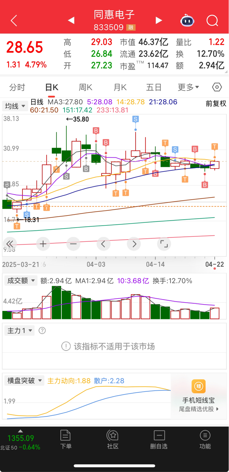 $同惠电子(SZ833509)$ 跟的$凯美特气(SZ002549)$ ,自身不强,希望原因不是一季报不及预期。依旧T了一下,底仓不动,晚上开盅看骰子。