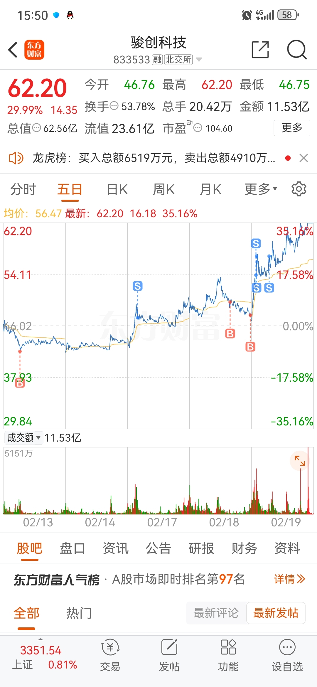 $骏创科技(SZ833533)$ 今天中午把我T飞了